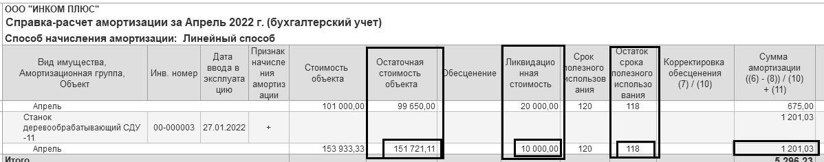 Станок до модернизации уже использовался два месяца (в феврале и в марте). Остаточная стоимость после модернизации по данным бухгалтерского учета составляет 141 721,11 рублей (142 733,33 + 11 200 – 1106,11 – 1106,11 – 10 000 (это ликвидационная стоимость)). Оставшийся срок полезного использования 118 месяцев (120 – 2). Алгоритм расчета амортизации для целей бухгалтерского учета будет следующий: 141 721,11 руб.: 118 мес. = 1 201 руб. 03.
