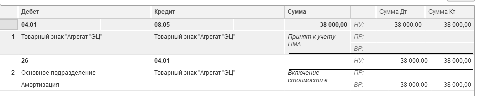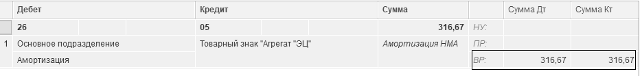 Вот, какая проводка должна получиться для бухгалтерского учета по НМА "Товарный знак" в апреле: