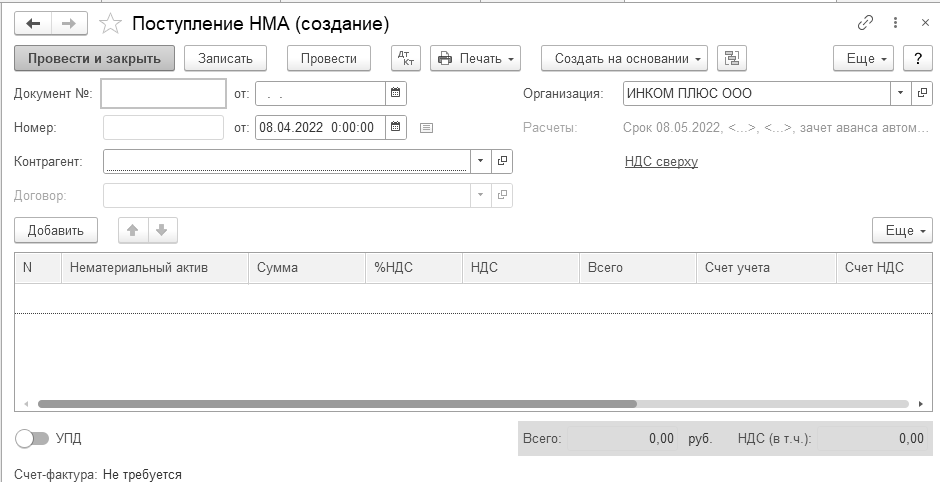 В шапке выбирается контрагент, от которого поступили НМА, договор расчетов и номер документа основания. Табличная часть заполняется поступившим нематериальным активом. В повале формы регистрируется счет-фактура поставщика.