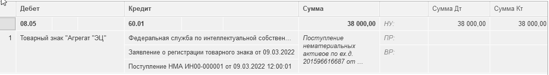 Ввод в эксплуатацию НМА состоялся 23.03.2022 года. Срок полезного использования товарного знака 10 лет указан в свидетельстве о регистрации № 20 от 09.03.2022 года. Основание – заявление о регистрации товарного знака от 09.03.2022 года. Счет-фактура № 20 от 23.03.2022 года.