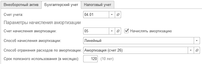 Закладка "Бухгалтерский учет". Счет начисления амортизации – 05. Способ начисления амортизации – линейный. Срок полезного использования НМА для целей бухгалтерского учета – 120 месяцев. Заполненная закладка "Бухгалтерский учет" представлена на рисунке 10.7.