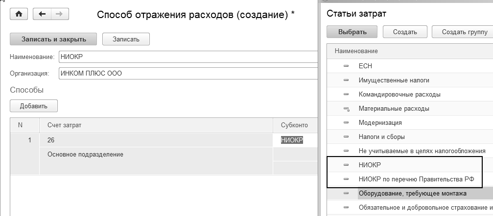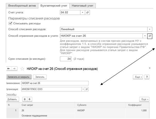 На закладке "Бухгалтерский учет" проследите наличие счета 04.02 для бухгалтерского учета. Если не рассчитывается, то сохраните документ при помощи кнопки "Записать". Установите срок списания 24 месяца. В бухгалтерском учете списание расходов по каждой выполненной научно-исследовательской, опытно-конструкторской, технологической работе производится одним из следующих способов: