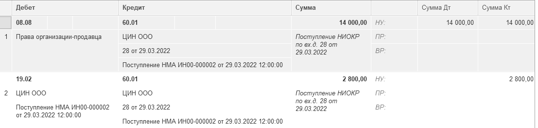 Передача прав производится на основании авторского договора № 28 от 29.03.2022 года. Назовем такие расходы – "Права организации-продавца". Сумма расходов по НИОКР – 14 000 руб., НДС 20% сверху. Счет-фактура и акт № 28 от 29.03.2022 года.