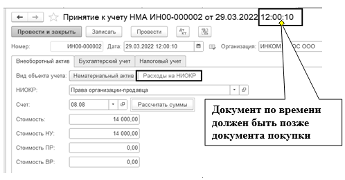 Когда стоимость НИОКР следует отразить по дебету 08.08 "Выполнение научно-исследовательских, опытно-конструкторских и технологических работ", в программе следует заполнить документ "Поступление НМА".