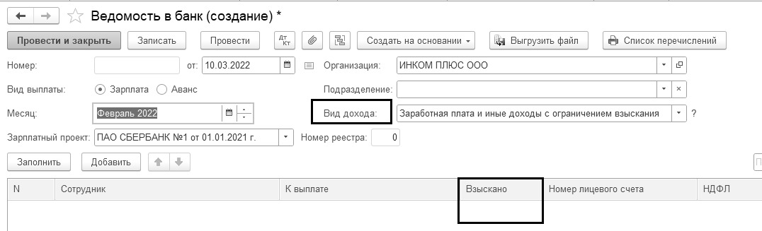 В документ "Ведомость в банк" с 01.06.2020 года добавлено новое поле "Вид дохода" (рис. 1.4.8). Если выбрать значение в этом поле, то при заполнении ведомости в нее попадут начисления, зарегистрированные с указанным видом дохода. Также добавлена новая колонка в табличную часть документов "Взыскано". В ней отражаются автоматически суммы, удержанные по исполнительным листам. Доходы с разными кодами попадают в разные ведомости.