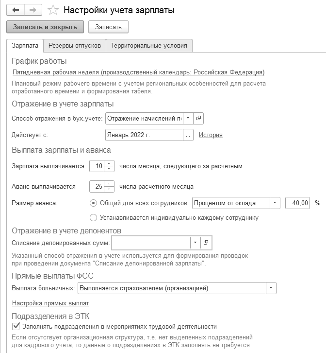 Кликнув по автоматически заполненной программой строке, пользователь попадает в форму "Настройки учета зарплаты", которая состоит из трех закладок: "Зарплата", "Резервы отпусков" и "Территориальные условия". В этой форме можно указать: