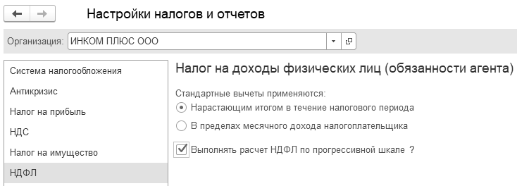Настройки зарплаты. Гиперссылка "НДФЛ" предлагает ознакомиться с параметрами расчета этого налога, и показывает: