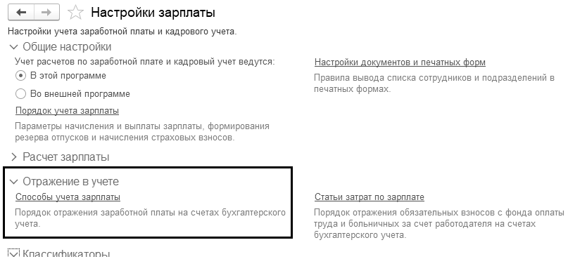 Гиперссылка "Настройки зарплаты" настраивает учет в базе по следующим направлениям: