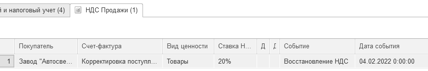 Просмотрите регистр "НДС продажи", который сформирует событие "Восстановление НДС" (рис. 12.5.4).