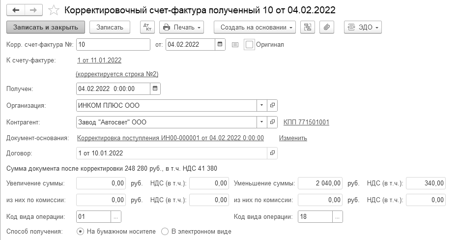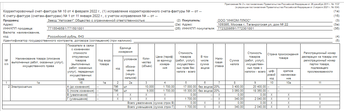 04.02.2022 года ООО "ИНКОМ ПЛЮС" получило корректировочный счет-фактуру № 10 от завода "АВТОСВЕТ" на сумму 41 380 рублей.