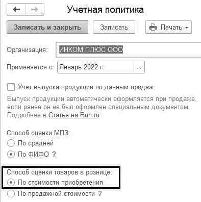 В ООО "ИНКОМ ПЛЮС" используется способ оценки товаров в рознице "По стоимости приобретения" (рис. 12.8.1).