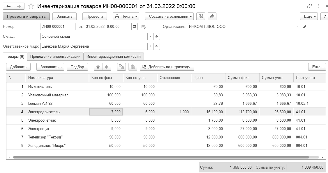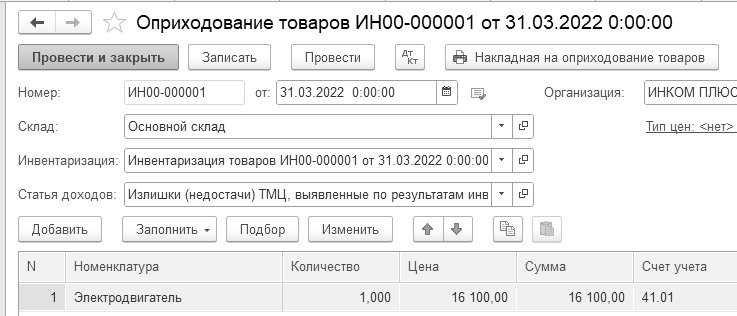 Результаты инвентаризации товаров на основном складе отражаются на основании данных протокола инвентаризационной комиссии от 31.03.2022 года. Результаты инвентаризации: приходуется излишек электродвигателя в количестве 1 шт. по цене 16 100 руб.