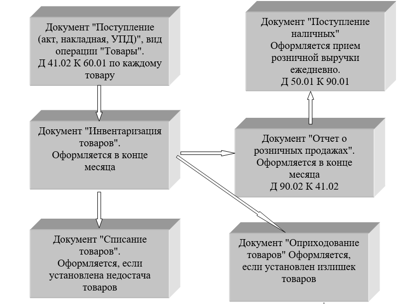 Порядок движения документов розничной торговой точки, где учет товаров ведется по стоимости приобретения, можно показать на следующей схеме (рис. 12.8.2).