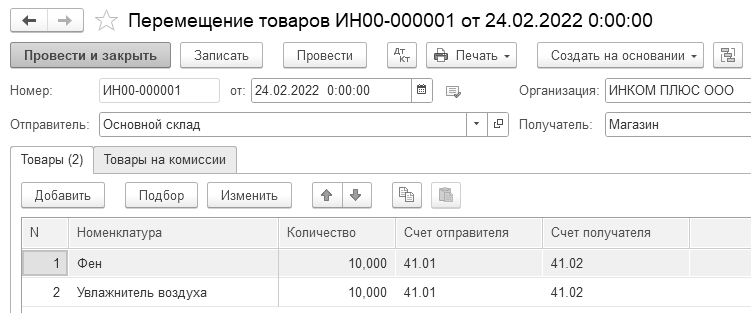 24.02.2022 года создайте документ "Перемещение товаров" и переместите в магазин 10 шт. фенов и 10 шт. увлажнителей воздуха.