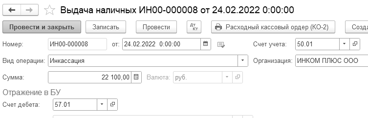 24.02.2022 года создайте документ "Выдача наличных" по виду операции "Инкассация". Сумма инкассации – 22 100 руб. (рис. 12.8.7).