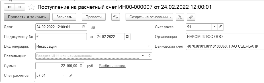 24.02.2022 года создайте документ "Поступление на расчетный счет". Выберите вид операции "Инкассация". Представлен документ № 6 от 24.02.2022 года.
