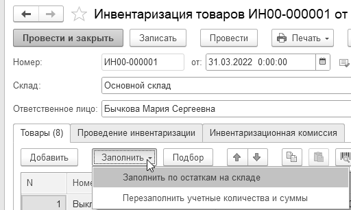 31.03.2022 года создайте документ "Инвентаризация товаров".