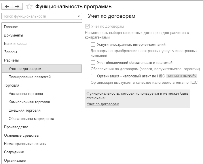 Рис. 1.5.1. Фрагмент формы "Функциональность", ссылка "Расчеты", учет по договорам