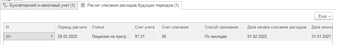 Закройте февраль 2022 года, проверьте документ "Регламентная операция" по виду операции "Списание расходов будущих периодов".