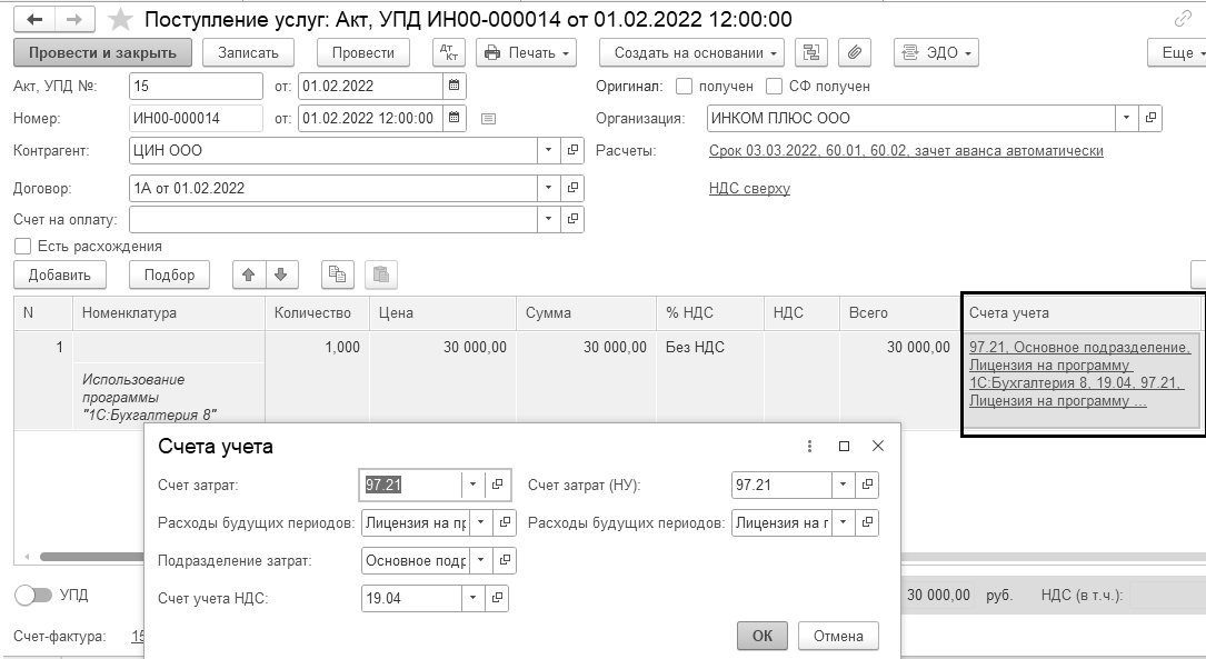 01.02.2022 года создайте документ "Поступление (акт, накладная, УПД)" от компании "ЦИН". Представлены акт № 15 и счет-фактура № 15, договор № 1А от 01.02.2022 года за программу "1С:Бухгалтерия 8" на сумму 30 000 руб.
