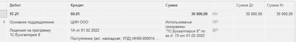 Выберите вид операции "Услуги (простая форма)". В номенклатуре ничего создавать не нужно, просто, в содержании операции укажите – "Использование программы "1С:Бухгалтерия 8"". Корсчет 97.21. Для счета 97.21 укажите аналитику: основное подразделение, РБП – "Лицензия на "1С:Бухгалтерия 8". Зарегистрируйте счет-фактуру поставщика.