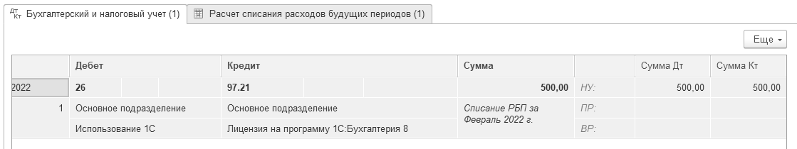 После проведения операции "Списание расходов будущих периодов" за февраль должны появиться бухгалтерская и налоговая проводки: