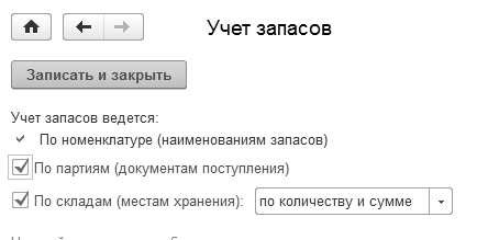 На ссылке "Учет запасов" установлен флаг "По партиям (документам поступления)". Учет по складам (местам хранения) ведется по количеству и сумме (рис. 15.2).