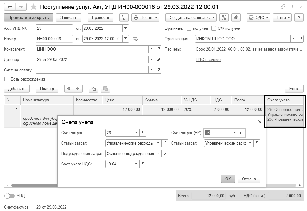 Цель: оформить документ "Поступление услуг: Акт, УПД". Списать средства для уборки на счет 26.