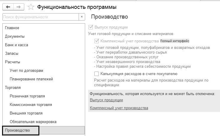 В настройке функциональности программы устанавливается, что в ней ведется учет производственных операций (рис. 16.1).