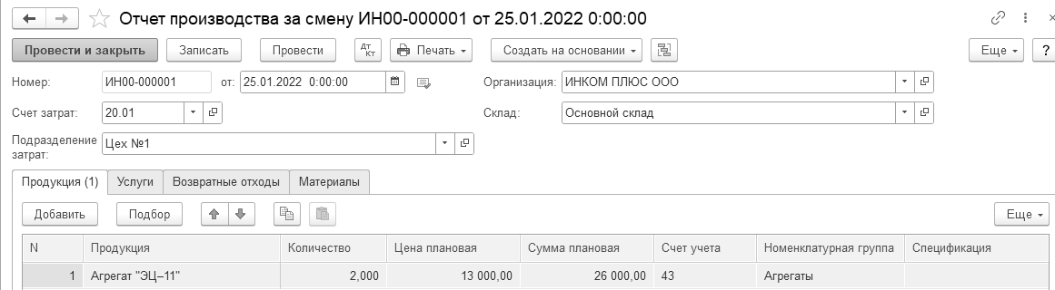 25.01.2022 года было выпущено два агрегата "ЭЦ–11". Создайте документ "Отчет производства за смену" и просмотрите его записи (рис. 16.10).