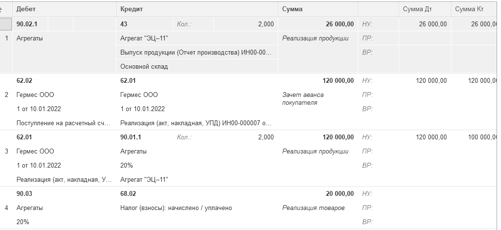 28.01.2022 года для ООО "ГЕРМЕС" по договору № 1 от 10.01.2022 года реализовано два агрегата "ЭЦ–11" на сумму 120 000 руб., в т. ч. НДС 20%.