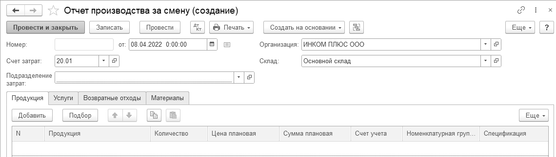 Документ "Отчет производства за смену" отражает в бухгалтерском и налоговом учете выпуск готовой продукции в количественном и стоимостном выражении (по плановой себестоимости), и предназначен для таких операций как, выпуск продукции, оказание внутренней услуги производственным подразделением, приход возвратных отходов на склад из производства, распределение прямых затрат на выпуск продукции.