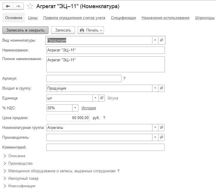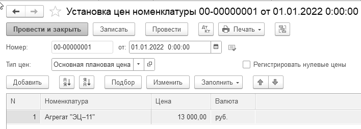 С 01.01.2022 года установите цену единицы агрегата "ЭЦ-11" в сумме 13 000 руб. в регистре сведений "Цены номенклатуры". Тип цены – "Основная плановая цена" (рис. 16.9).