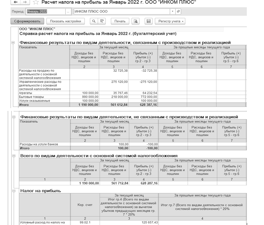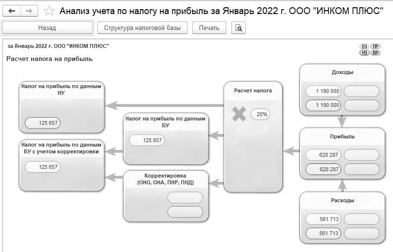 Справка-расчет "Расчет налога на прибыль" отражает сопоставление доходов и расходов организации на момент проведения регламентных операций закрытия месяца: