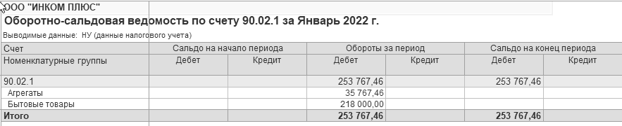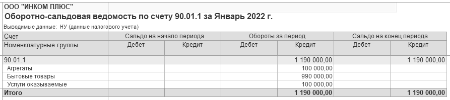 Разберемся с доходами. Сформируйте оборотно-сальдовую ведомость по счету 90.01, но в панели настроек снимите флаг "БУ (данные бухгалтерского учета)" и установите флаг "НУ (данные налогового учета)". Детализации по ставкам НДС нет. Отбор по номенклатурным группам оставьте. Отчет показан на рисунке 17.12.