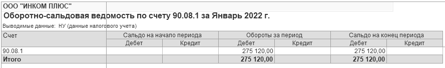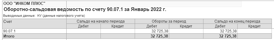 Разберемся с расходами. Сформируйте оборотно-сальдовую ведомость по счету 90.02.1, 90.07 и 90.08. Отчеты показаны на рисунках 17.13 - 17.15 соответственно.