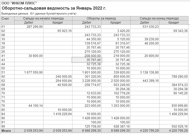 Остатков на 01.02.2022 года по счетам 20.01 "Основное производство", 26 "Общехозяйственные расходы" и 44.01 "Расходы на продажу" быть не должно. Обороты по дебету и кредиту счета 43 "Готовая продукция" за январь должны быть равны сумме 35 767,46 руб.
