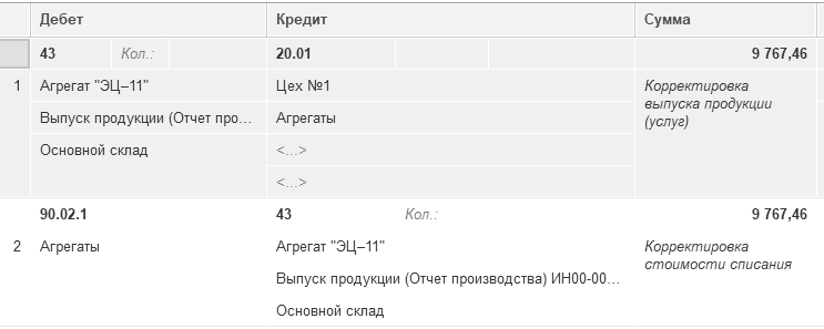 Бухгалтерская запись Д 90.02.1 К 43 на сумму 9 767,46 руб. получилась как разница между плановой и фактической стоимостью реализованной продукции.
