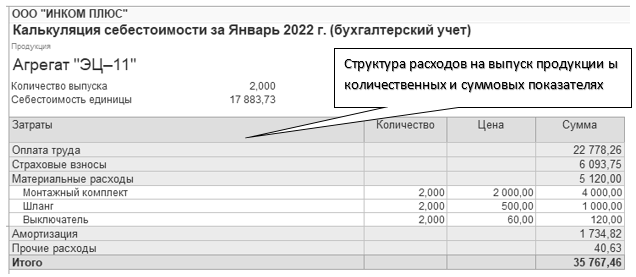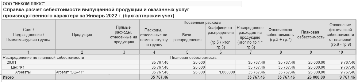 28.01.2022 года реализовано два агрегата "ЭЦ-11" по плановой стоимости 13 000 руб. Итого реализовано по плановой цене на 26 000 руб. Фактическая стоимость единицы продукции 17 883,73 руб. (35 767,46 / 2 ед.)