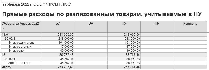 · прямых расходов по реализации товаров, учитываемых в НУ на сумму 253 767 руб.;