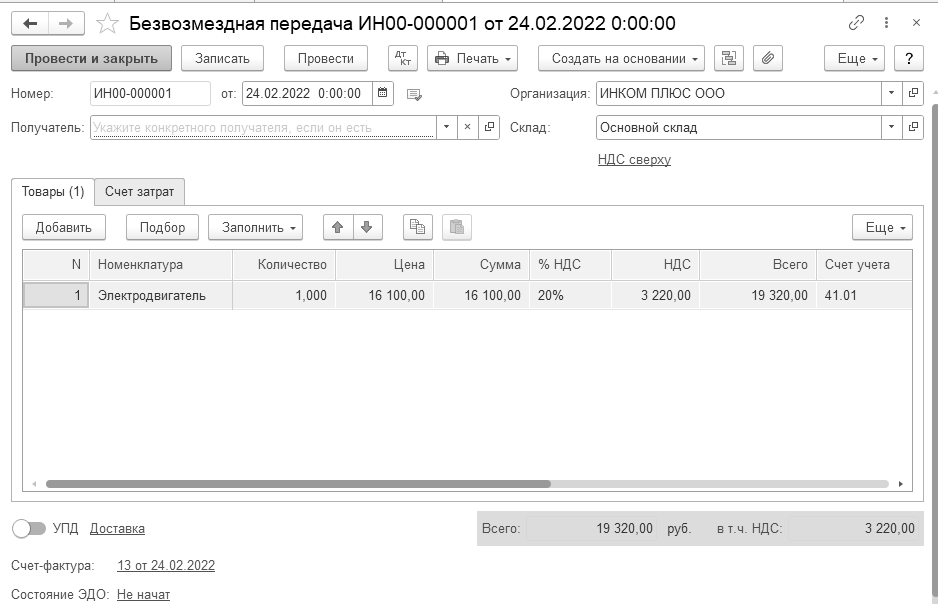 24.02.2022 года создайте документ "Безвозмездная передача".