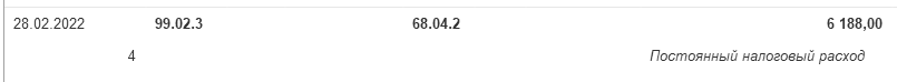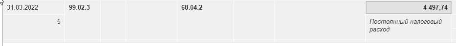 20 200 × 20% = 4 040 руб. + 457,74 руб. (часть ПР от представительских) – постоянная разница марта. Эта сумма также видна на рисунке 20.1.7. Итого, сумма 4 497,74 руб. документом "Регламентная операция" за март определена в виде постоянного налогового расхода.