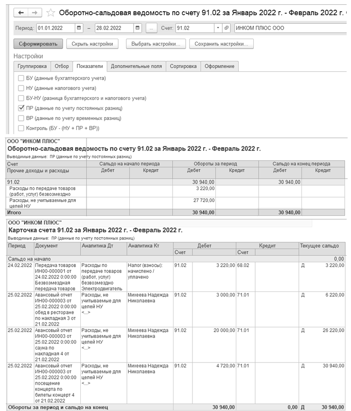 Рис. 20.1.6. Фрагмент окна отчета "Карточка счета" 91.02 за март.