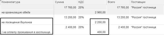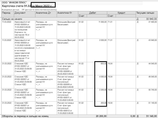В марте была выдана Малышеву на представительские расходы сумма 38 000 руб. Сотрудник представил авансовый отчет от 11.03.2022 года, в котором затраты были отнесены на счета 26 и 91.02. Такие расходы в налоговом учете нормируются. Сумма 15 600 руб., в т. ч. НДС (посещение боулинга – 13 200 руб. и проживание других представителей совещания – 2 400 руб.), не принимаются для целей налогового учета. А сумма 2 600 руб. (2 200 + 400) это НДС, который не должен приниматься к вычету (рис. 20.1.4).