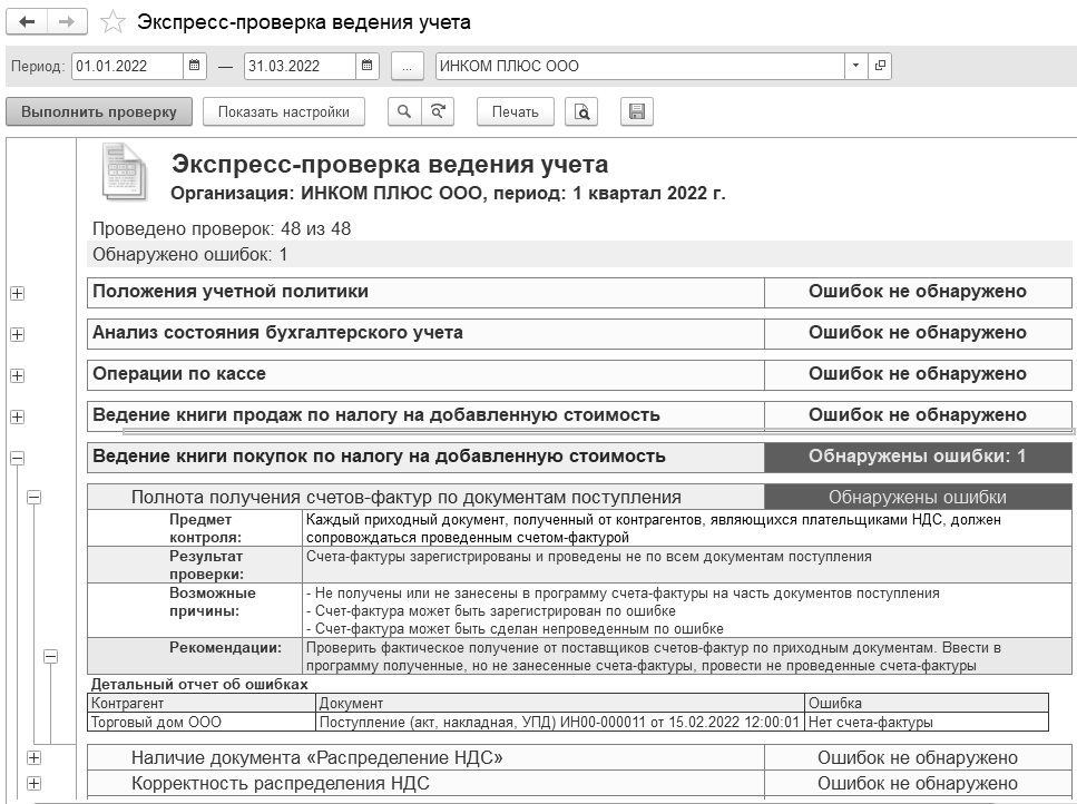 Выполните обработку "Экспресс-проверка ведения учета". Выберите период –