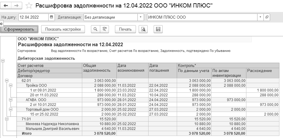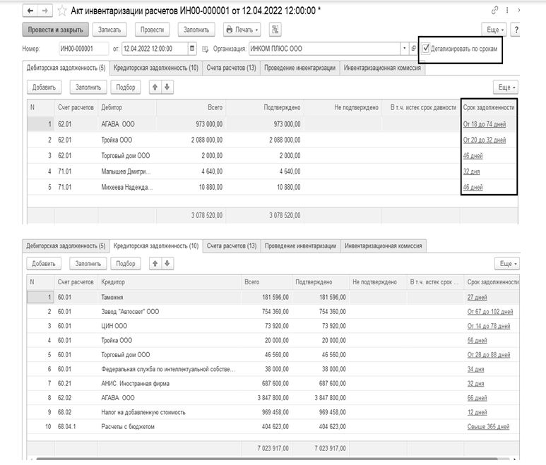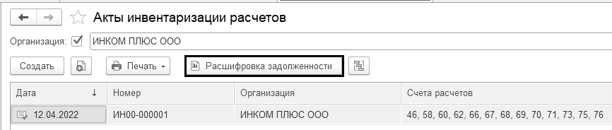 Заполнить отчет "Акт инвентаризации расчетов" по состоянию на 12 апреля 2022 года по ООО "ИНКОМ ПЛЮС" (рис. 22.1.7).