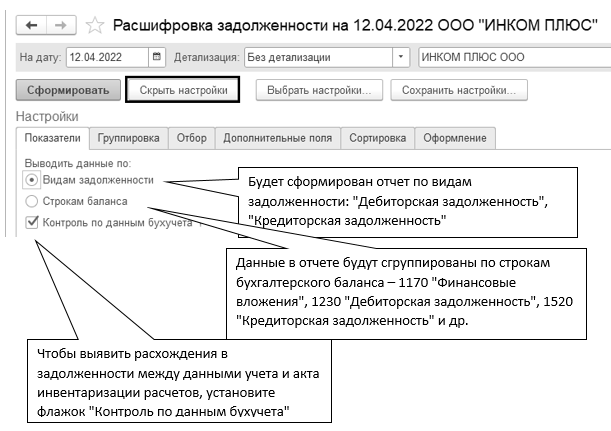По кнопке "Показать настройки" предлагаются параметры формирования отчета (