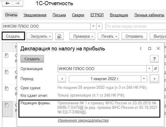 При создании отчета из сервиса "1С:Отчетность" программа автоматически предлагает ту редакцию формы, которая соответствует выбранному периоду (рис. 22.1.11).