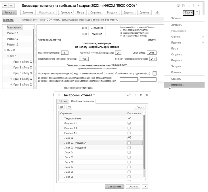 "Настройка" отчета – если отчет состоит из многих разделов (например, это почти все налоговые декларации), форма отчета реализована в виде диалога с закладками, а в верхней командной панели присутствует кнопка "Еще/Настройка". По нажатию этой кнопки вызывается диалог настройки, в котором можно указать – какие разделы отчета следует показывать на экране и выводить на печать.