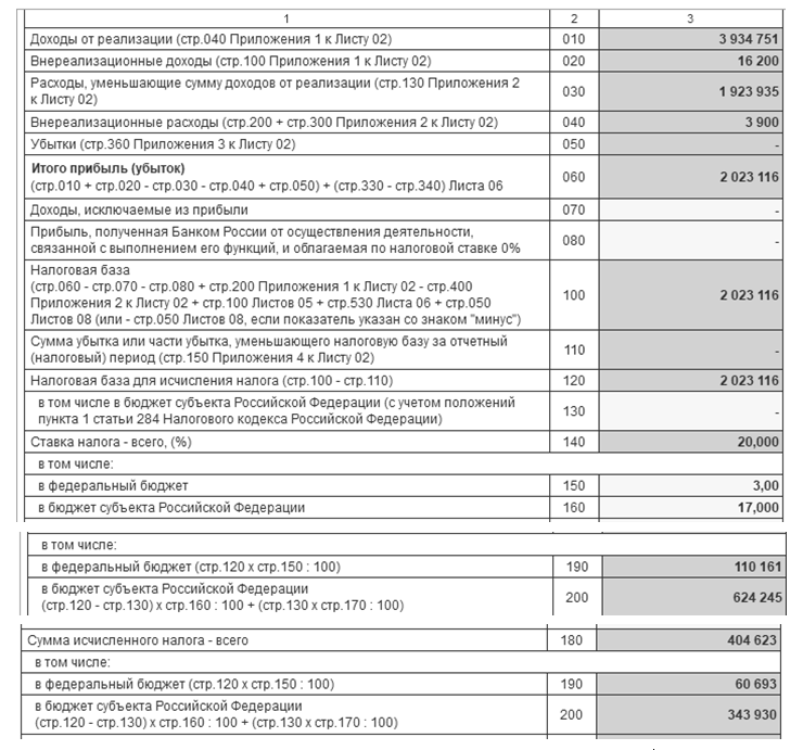 Рис. 22.1.13. Фрагмент формы отчета "Декларация по налогу на прибыль", лист 02